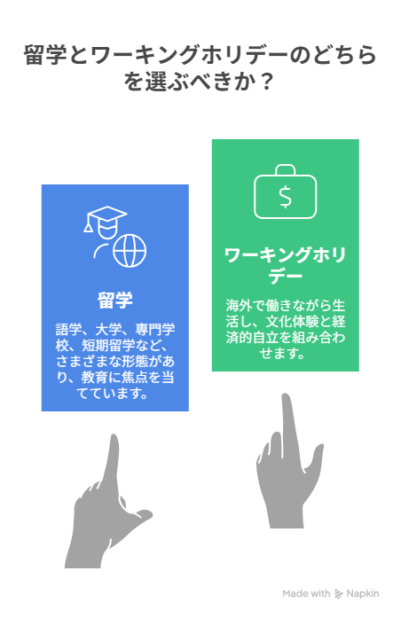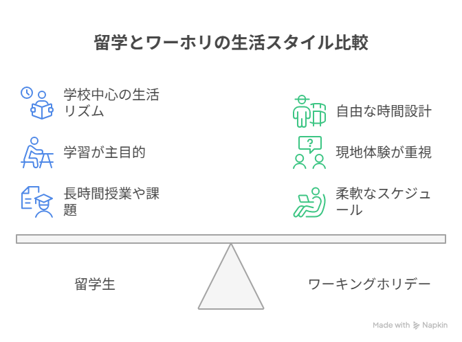 留学は「学業」が中心で、就労が認められない場合もあります。対してワーホリは「観光と労働の両立」を可能にした制度であり、滞在中にアルバイトや職業体験が可能です。
