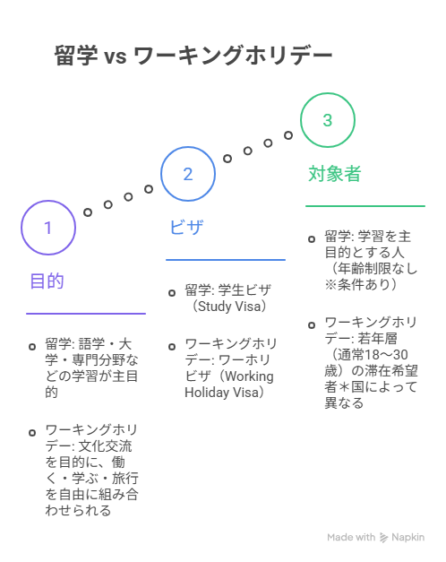 | 項目 | 留学 | ワーキングホリデー |